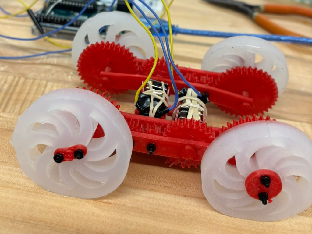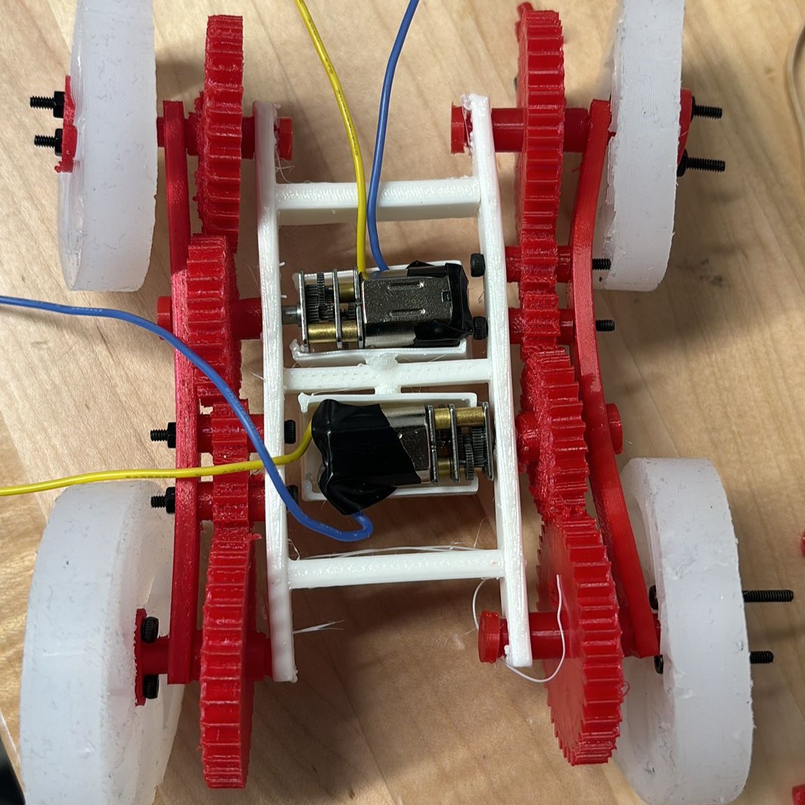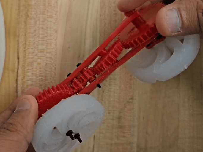 Although gears were the preferred option compared to pulleys and timing belts due to their high torque output, reliability, and greater efficiency in power transmission, we wished to ensure that the entire mechanism was designed to excel under competition conditions. Therefore, we utilized 95A TPU, a 3D printing filament that results in soft, compliant print bodies. This decision was made to keep the whole mechanism as soft and adaptable as possible, effectively addressing the unique and varying requirements of the competition. By implementing this material choice, the mechanism not only became lightweight but also compliant, allowing for dynamic responses to the terrain. This flexibility had the remarkable effect of enabling the entire gear train to twist and conform as needed, ensuring the robot could seamlessly navigate complex obstacles without sacrificing performance or risking damage to its components.