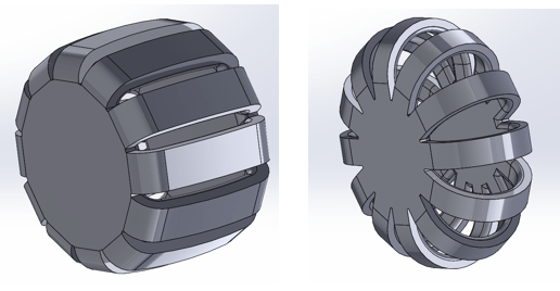 Inspired from the concept of airless tires3, we incorporated silicone wheels made of Ecoflex-0030 into the design, depicted in Fig.~\ref{fig:wheel}. These wheels provided the necessary traction and flexibility required for varied surfaces, including sand and inclined planes. The principle behind using angled spokes is rooted in the need to manage how the wheels deform when subjected to external forces. By angling the spokes, the wheels can flex in a controlled manner, absorbing impacts more effectively and adapting to surface irregularities without compromising structural integrity. This controlled deformation is critical in maintaining consistent contact with the ground, thereby improving traction and stability. Moreover, the deformation characteristics introduced by the angled spokes help in distributing the stresses more evenly across the wheel structure. This distribution is vital for preventing localized stress concentrations, which could lead to premature failure of the wheel material, especially under the harsh conditions of a competition. The ability of the wheels to deform and return to their original shape efficiently also aids in preserving the motor’s energy, contributing to better energy management and prolongation of the robot’s operational time.